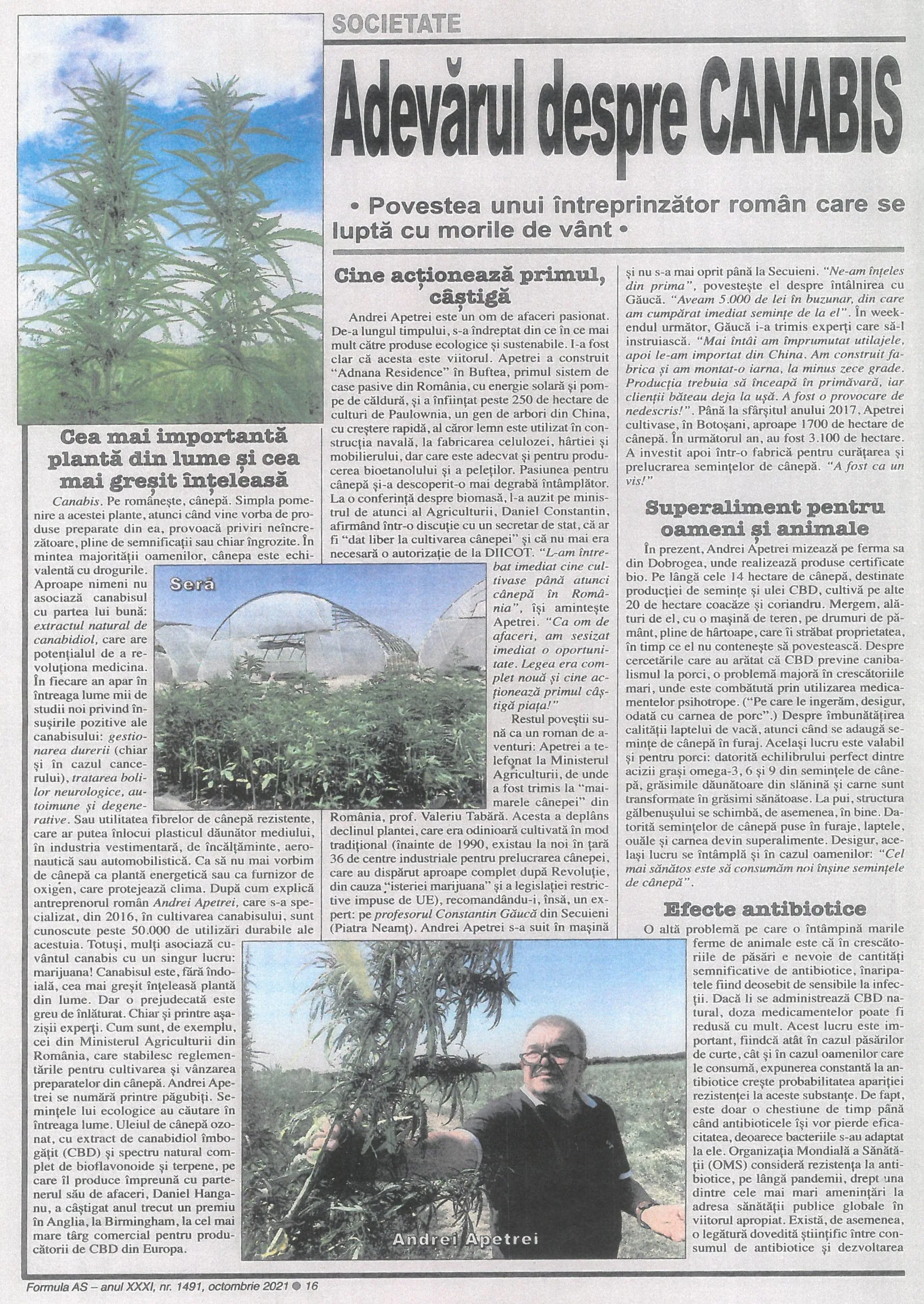 Canabisul este fără îndoială cea mai greșit înțeleasă plantă din lume. Dar o prejudecată este mereu de înlăturat. Ministerul Agriculturii din România stabilește în reglementări pentru cultivarea și vânzarea preparatelor din cânepă . Andrei Apetrei se numără printre păgubiți, iar semințele lui ecologice au căutarea întregii lumi. Uleiul de cânepă ozonat cu extract de canabidiol îmbogățit (CBD) Și spectrul natural complet de bioflavonoide și terpene, pe care îl produce împreună cu partenerul sau de afaceri Daniel Hanganu, A câștigat anul trecut un premiu în Anglia, la Birmingham, La cel mai mare târg comercial pentru Pro lucrătorii de CBD din Europa.