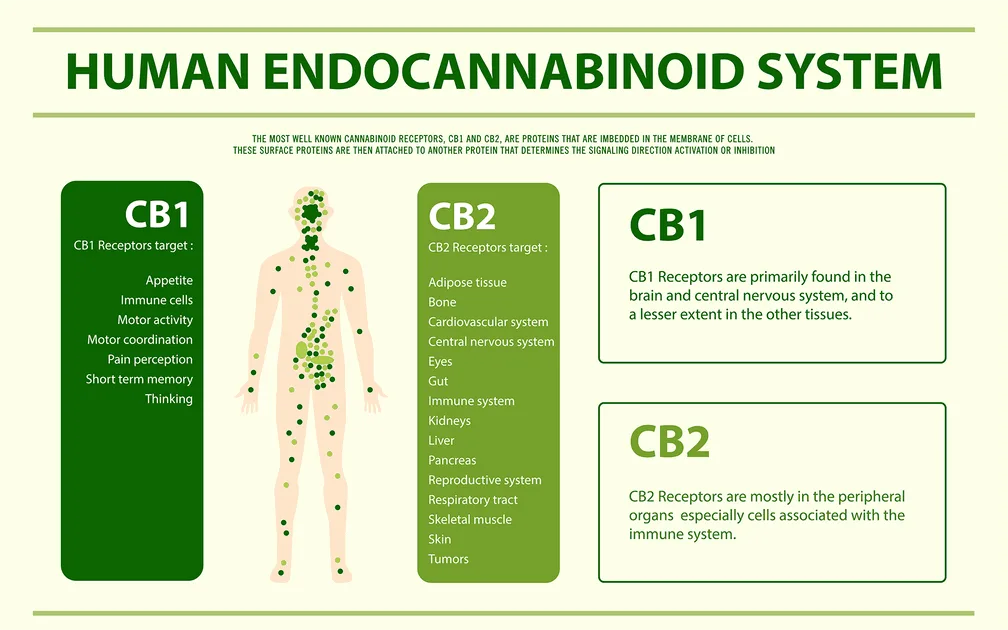 Acești receptori se găsesc în întregul organism. Endocannabinoizii se leagă de ei pentru a semnala că ECS trebuie să ia măsuri. Există doi receptori endocanabinoizi principali: